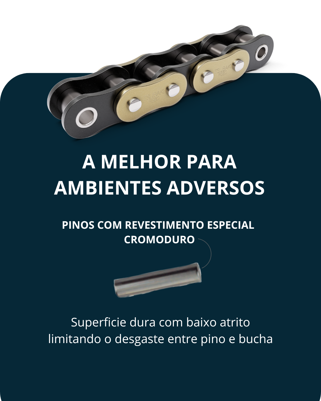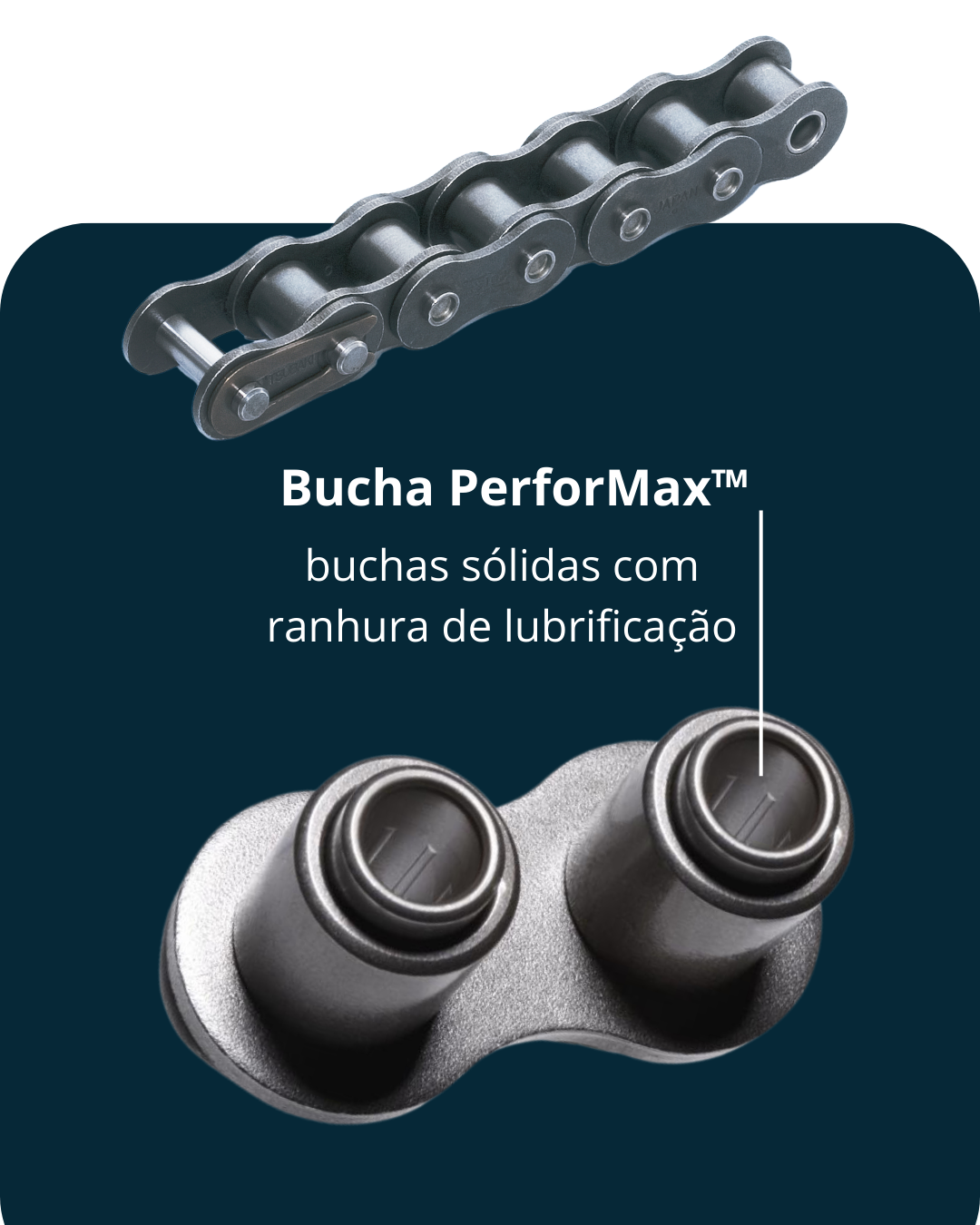 A Titan incorpora melhorias exclusivas, como pinos com superfície endurecida e de baixo atrito, que reduzem o desgaste entre pino e bucha, garantindo vida útil superior.