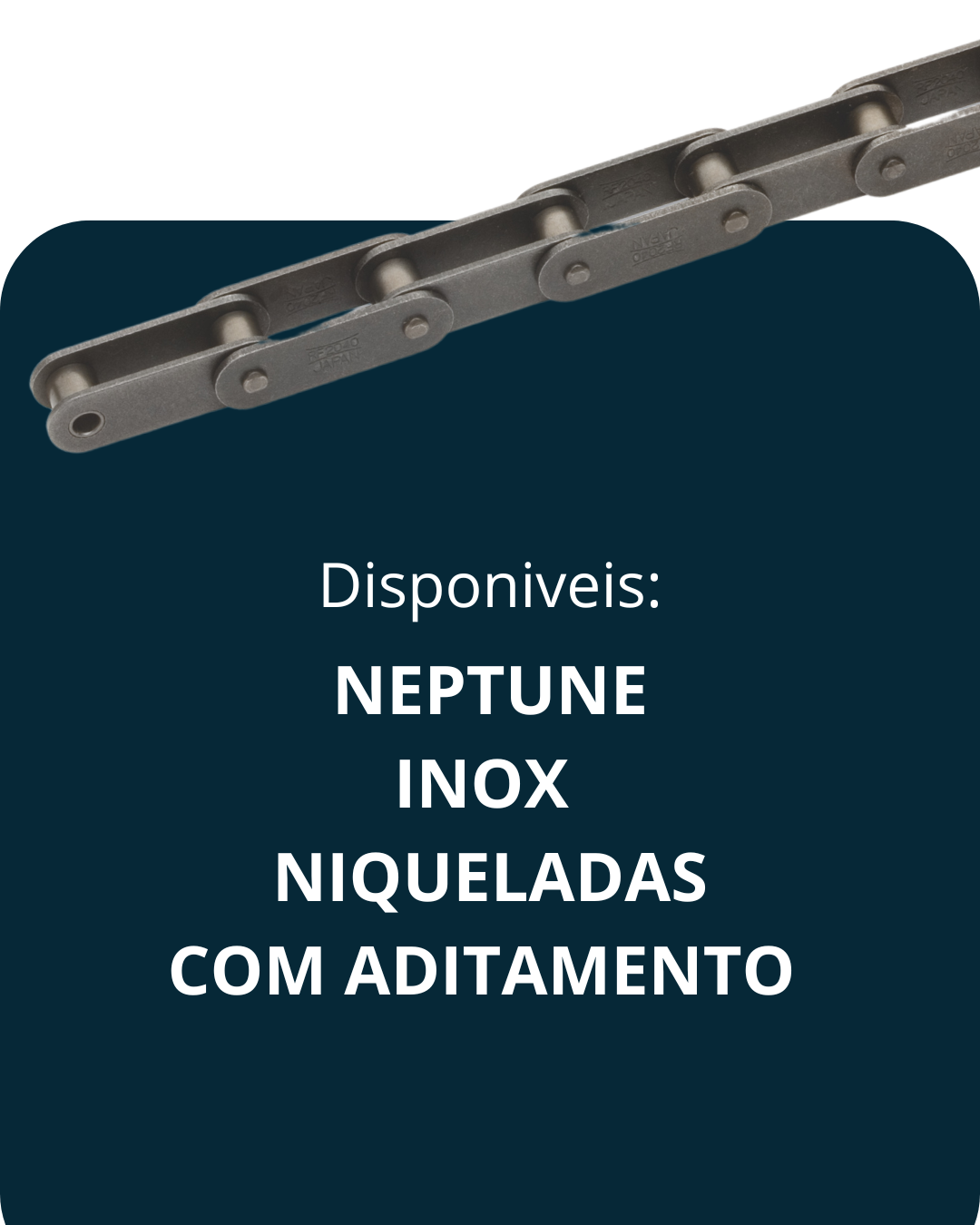 A corrente Neptune da Tsubaki oferece resistência excepcional à corrosão, sendo ideal para aplicações expostas à água, água salgada, produtos químicos e alta umidade.